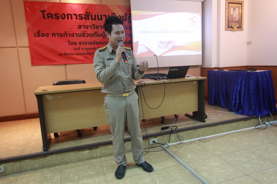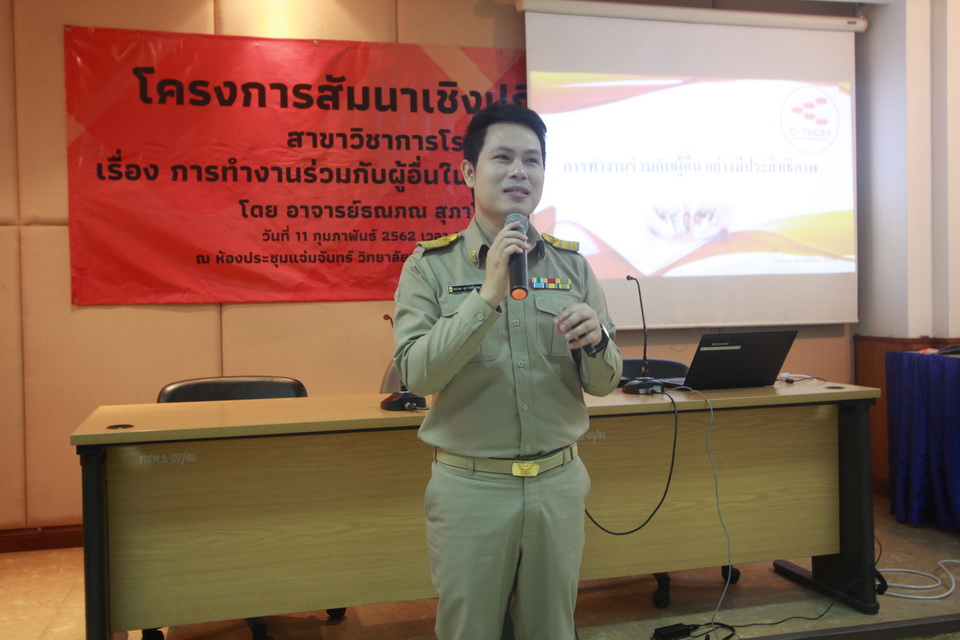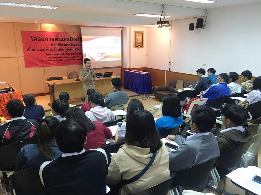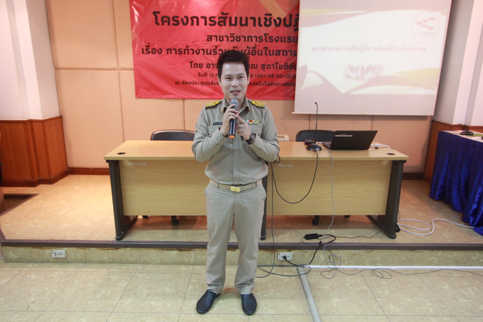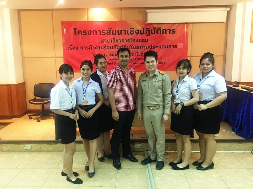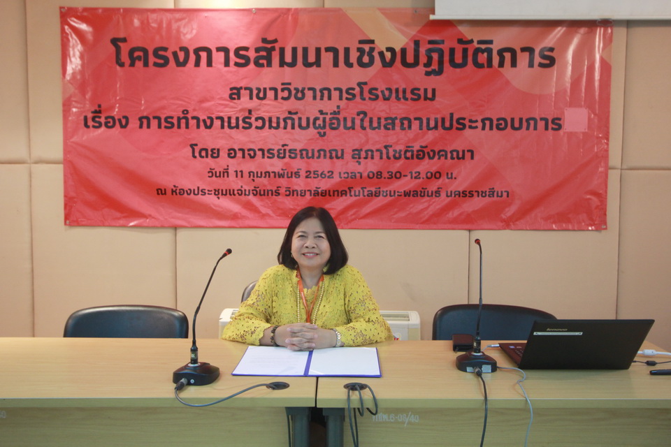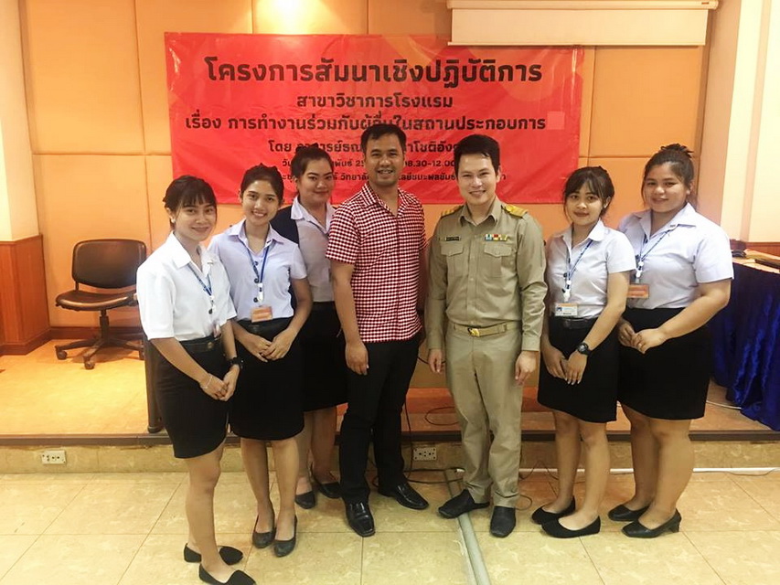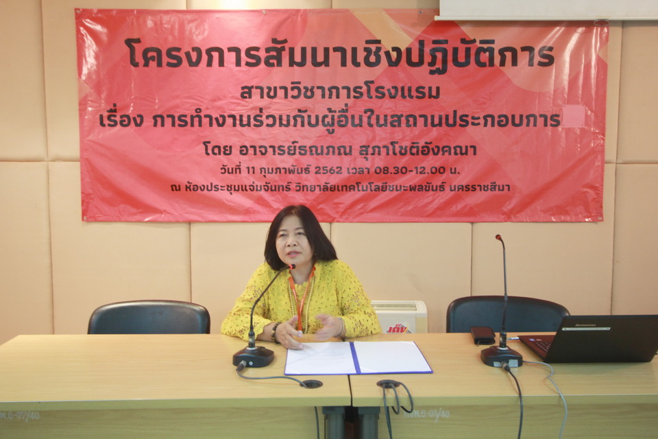 โครงการสัมมนาเชิงปฏิบัติการ สาขาวิชาการโรงแรม เรื่อง การทำงานร่วมกับผู้อื่นในสถานประกอบการ โดย อาจารย์ธณภณ สุภาโชติอังคณา วันที่ 11 กุมภาพันธ์ 2561 เวลา 08.30 - 12.00น. ณ ห้องประชุมแจ่มจันทร์ วิทยาลัยเทคโนโลยีชนะพลขันธ์ นครราชสีมา