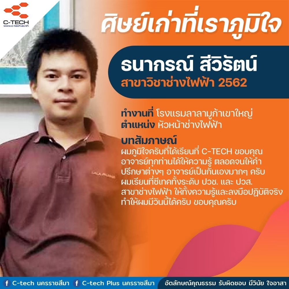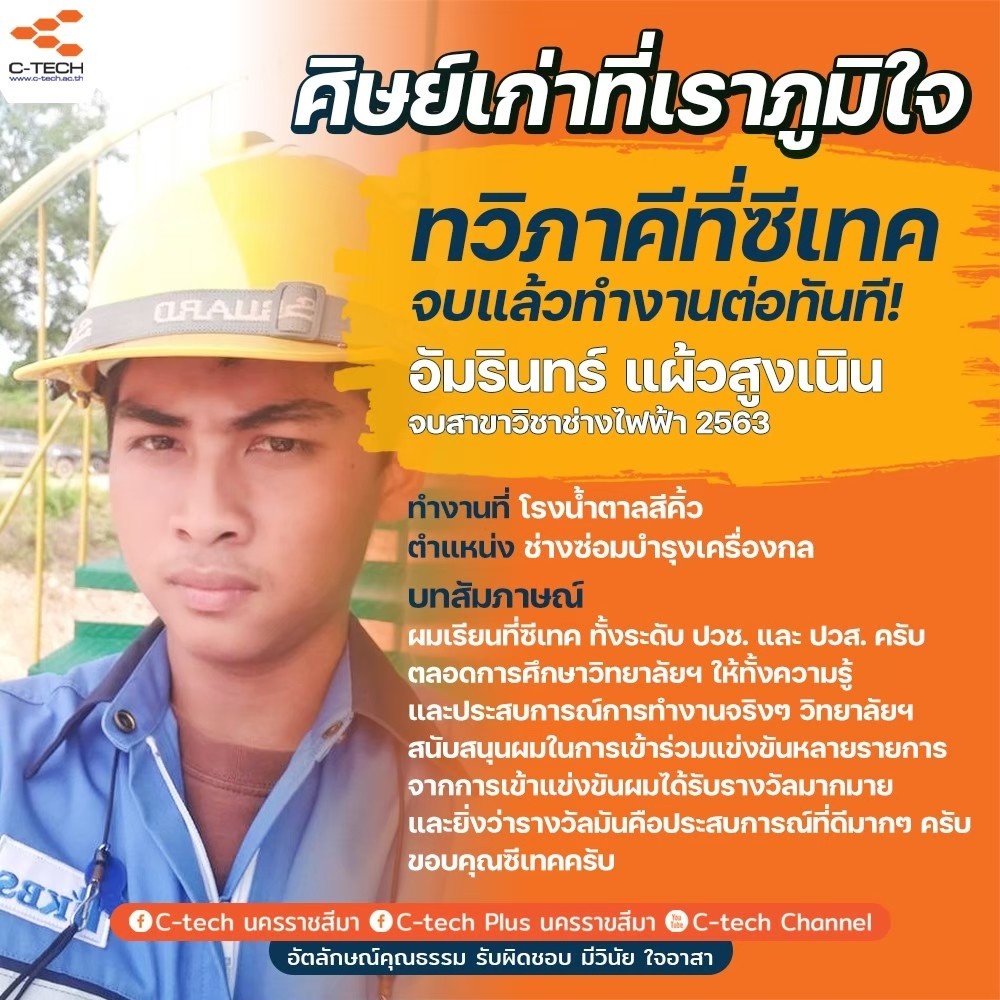 มีความประทับใจและดีใจ ที่เข้ามาเรียนที่ซีเทค การฝึกปฏิบัติ แบบเป็นทีม ทำให้มีความเข้าใจในหน้าที่ ที่ได้รับมอบหมาย ซึ่งขาดสิ่งเหล่านี้ไป การเข้าสังคมการทำงานจะเป็นเรื่องยาก จึงต้องขอบคุณ C-TECH ที่สอนให้มีประสบการณ์ที่ดีๆ